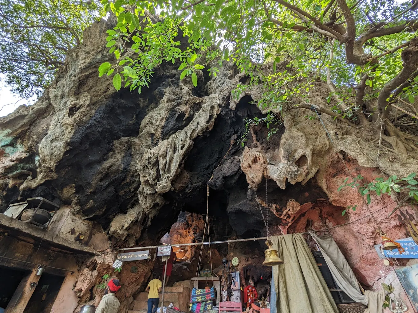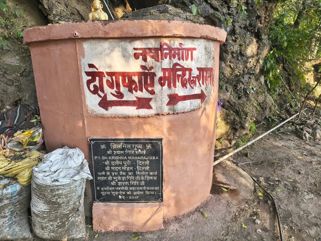 It is located near Rishikesh in the Himalayan foothills and requires a short forest trek.